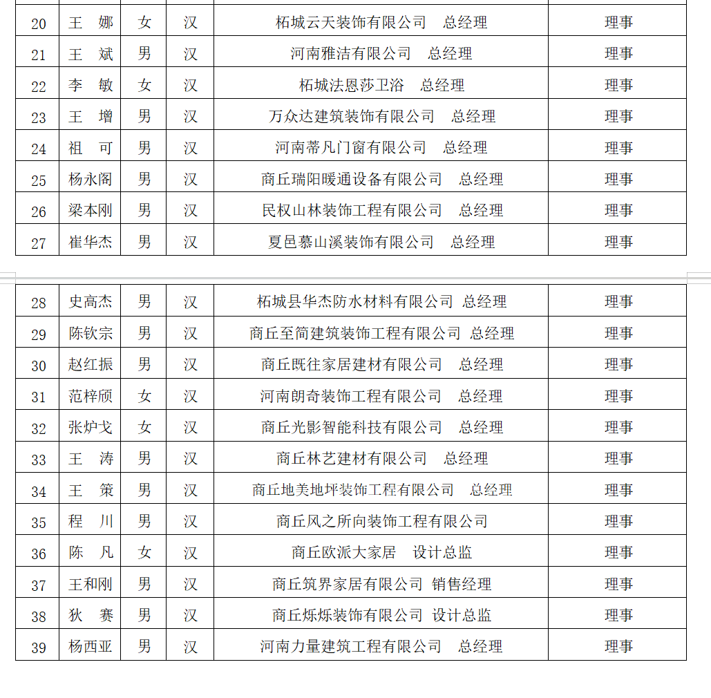 商丘市建筑装饰商会第三届理事会拟任理事及拟任负责人职务公示(共39位)